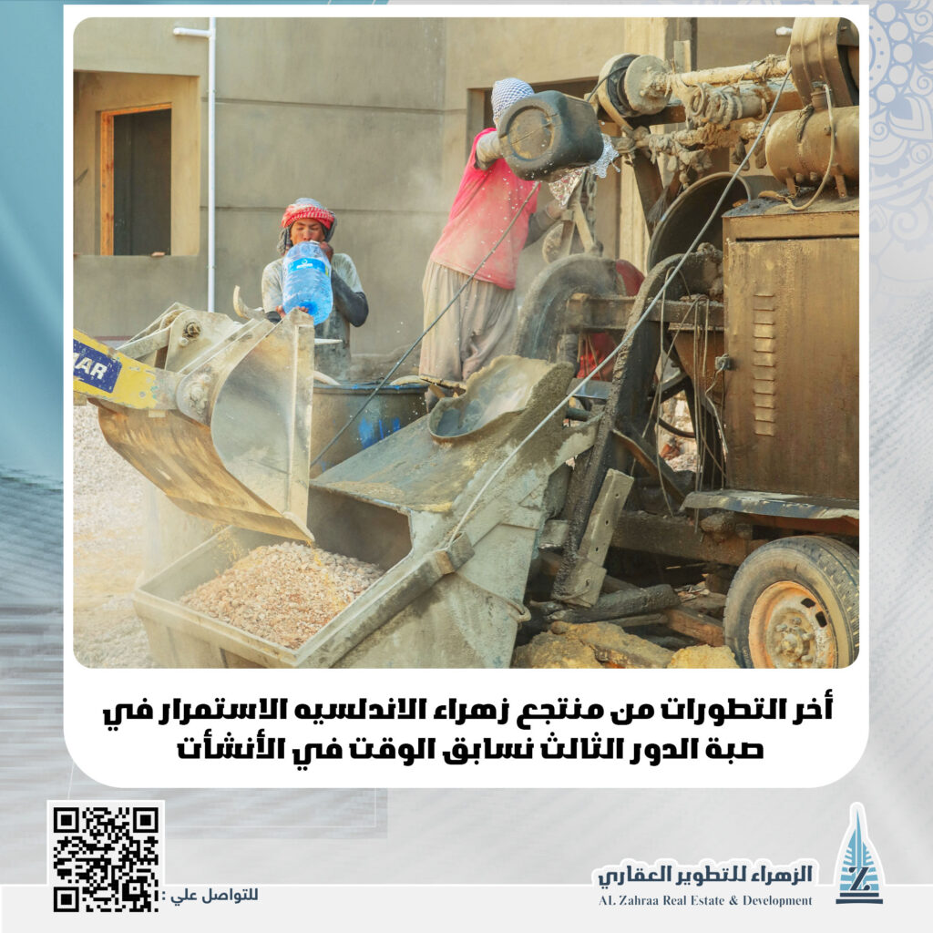 تواصل شركة الزهراء للتطوير العقاري أعمال الإنشاءات في منتجع زهراء أندلسية بكفاءة عالية؛ فقد تم الانتهاء من صب الدور الثالث بنجاح،